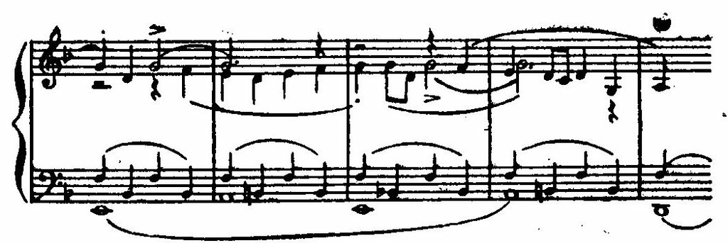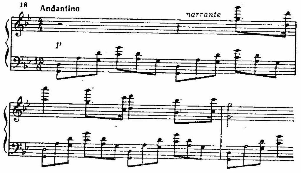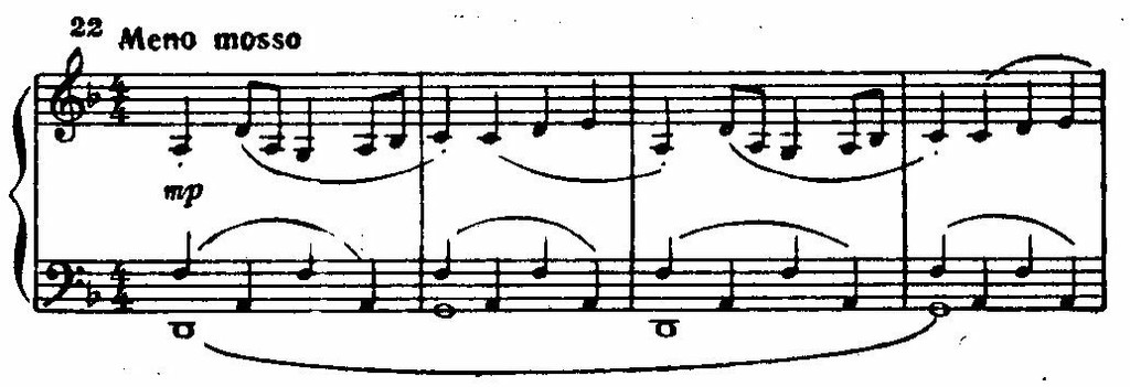 Теме (Meno mosso) предшествуют очень яркие и красочные аккордовые звучания фортепиано «издалека» (по типу импрессионистических звучаний, например, в «Затонувшем соборе» Дебюсси). В дальнейшем этот же эпизод повторяется с ремаркой «penseroso» («задумчиво») .