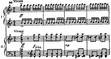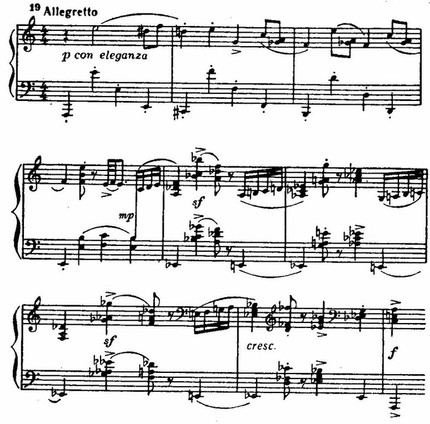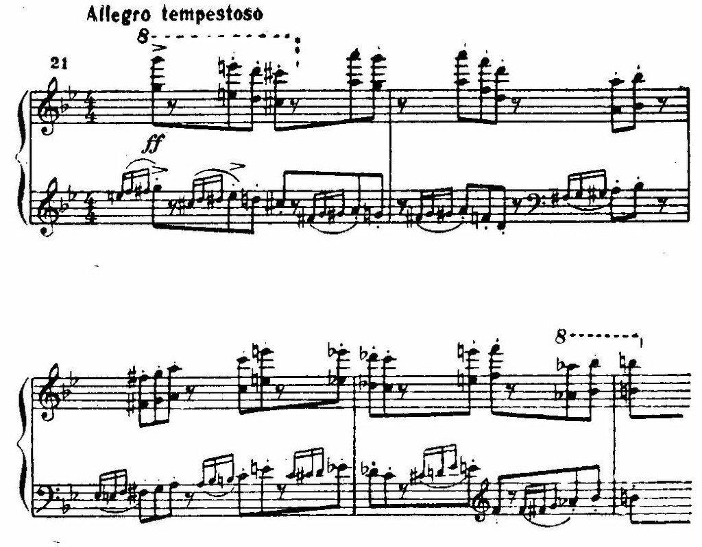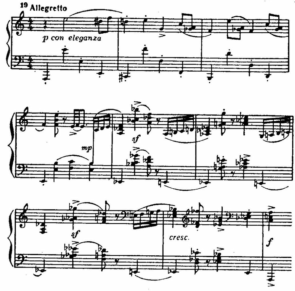 Первая тема (ниже приводим партию фортепиано) — угловатая, с хроматизированной основой, множеством скачков, резких перебросов мелодии из одного регистра в другой, причем нередко неустойчивый ход на септиму или нону в одном регистре разрешается в устой в другом регистре — типично прокофьевский прием!
