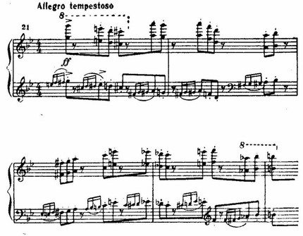 Но в еще большей степени опирается он в разработке на фактурно новый, типично романтический материал, идущий в своих истоках от возвышенного пафоса Сезара Франка и даже протестующе трагедийной патетики Шопена, хотя и сильно переработанных на «прокофьевский манер». Нагнетание колоссальной напряженности приводит к главной кульминации всей первой части. В этот момент вступает оркестр (Tempo I).