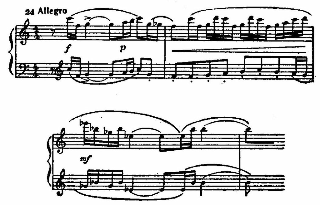 Общность начальных интонаций обеих тем несомненна (первые три звука). Но характер их совсем разный. Это — пример органической связи резко противоположных тем в произведениях Прокофьева. Впрочем, интонационная связь между темами в Третьем концерте вообще очень сильна и легко обнаруживается при детальном рассмотрении мелодики.