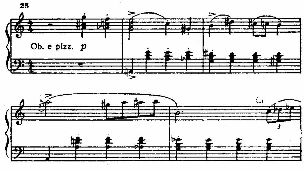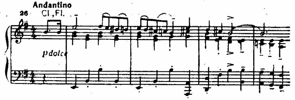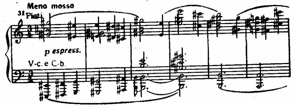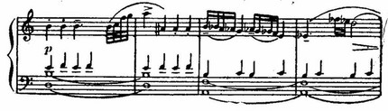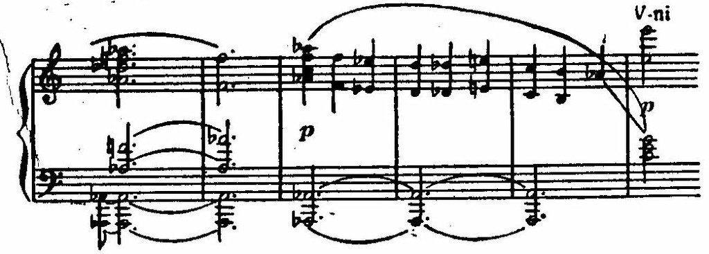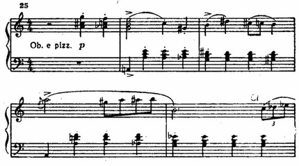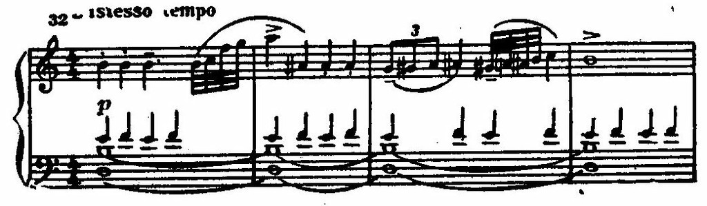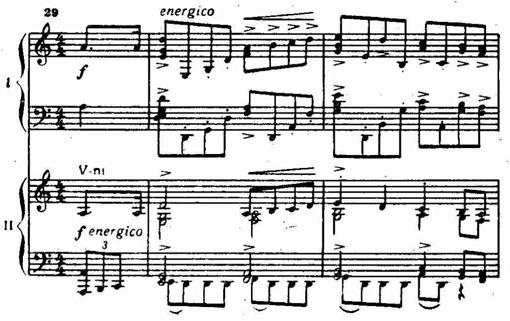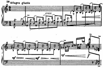 Ее сменяют стремительные фигурации струнных, а затем — энергичная, как бы вырвавшаяся на свободу, тема главной партии у фортепиано. Чеканность ритма и волевая акцентировка подчеркиваются унисонами. Стихия распева сталкивается с контрастной стихией ритма; стихия ритма побеждает (приводим партию фортепиано):