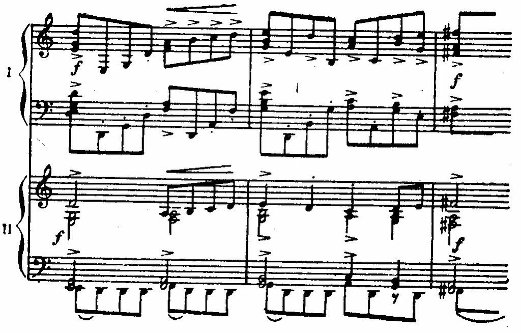 Пятая вариация поначалу непосредственной связи с темой не имеет. Это — резко акцентированный марш с подчеркнутой механичностью (приводим партию фортепиано):