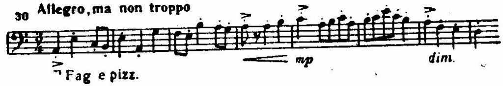 Неожиданно вторгается шуточно «ковыляющая», «детская» тема. Быстрые «всплески» и нарочитая смена острого staccato и плавного tenuto придают всему эпизоду характер забавы: