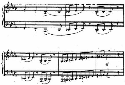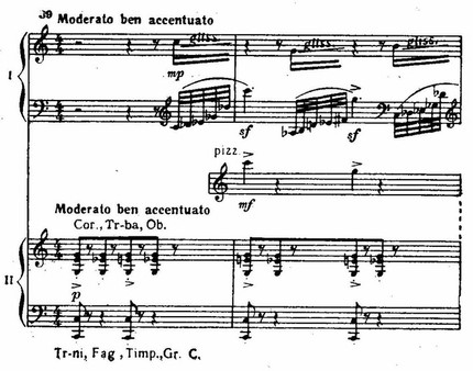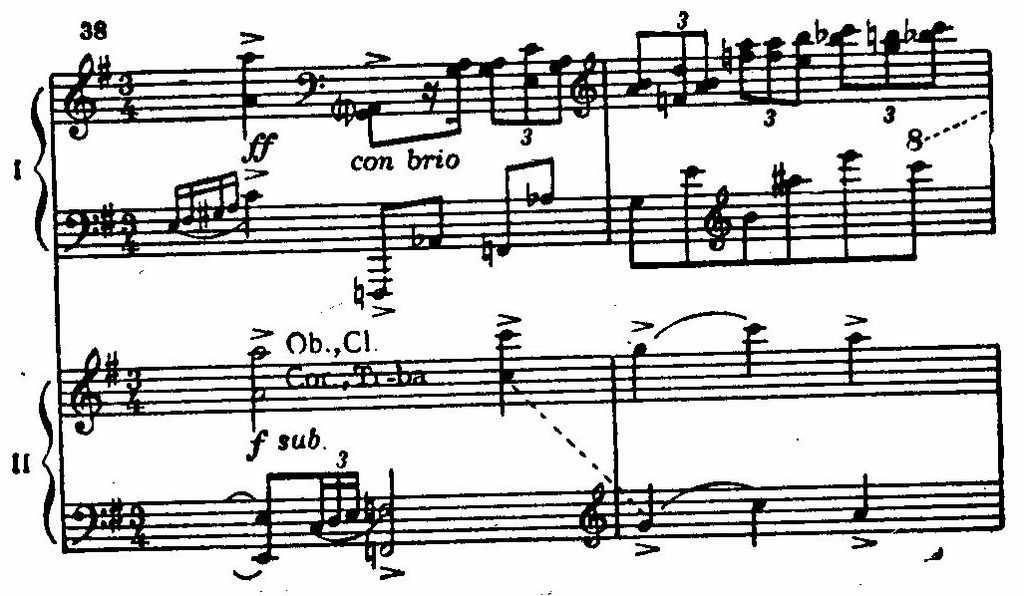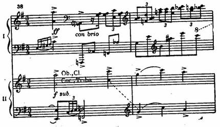 В завершении первой части, не лишенной признаков мозаичности, вслед за веселой гротескной эксцентриадой (реприза главной партии) звучат мощные гирлянды аккордов фортепиано и оркестра (con precisione), как бы в соперничестве наскакивающие друг на друга.