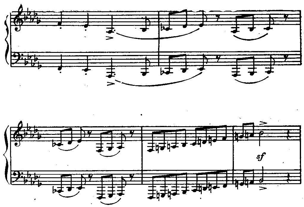 Финал, пятая часть (Vivo), написан вдохновенно. Яркий, разнообразный материал воплощен в сонатной форме. Особенно запоминаются две темы: удивительно легкая, подвижно острая — первая в си-бемоль миноре (приводим партию фортепиано):