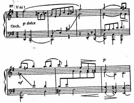 Разработка также сжата (Характерные ремарки «col pugno», которым, кстати, и сам автор не следовал, исполняя концерт, как он признавался впоследствии, были им выставлены «для устрашения бабушек»...). С цифры 18 (Meno mosso) начинается (в оркестре) средний эпизод в трехчастной форме с чертами мечтательной танцевальности.