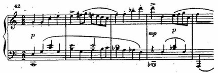 и, после повторения главной партии в той же тональности, чуть маршеобразная заключительная (т. 38, духовые и триольные пассажи фортепиано) (Л. Гаккель выдвигает заметно иную концепцию в анализе формы первой части, см. стр. 102—103 работы «Фортепианное творчество С. С. Прокофьева».).
