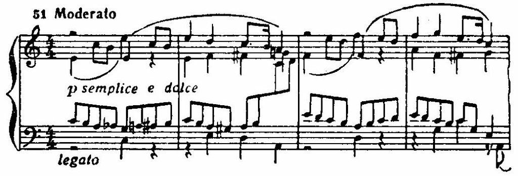 Появляется спокойная, певучая и нежная тема побочной партии (Moderato). Она начинается с вступительного раздела. Неторопливое и плавное гаммообразное движение (четыре такта) здесь как бы подготавливает состояние умиротворенности и вводит в побочную партию в C-dur — простую и напевную. Двадцать тактов темы побочной партии — один из замечательных, впечатляющих непосредственностью лирического высказывания примеров чисто русского прокофьевского письма. Сохраняя индивидуальный почерк и не идя по пути элементарного цитирования фольклора, композитор создает классическую по национальной традиции и народную по духу новую мелодику уравновешенного песенного склада.