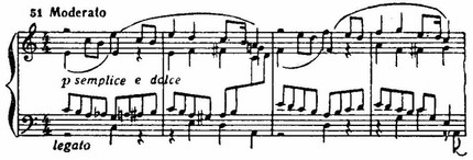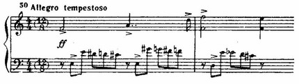 Основная тема, с ее трубно-призывной интонацией, подготовленной предыдущим кратким восхождением по звукам трезвучия на фоне активного движения бурлящими триолями, открывает произведение.