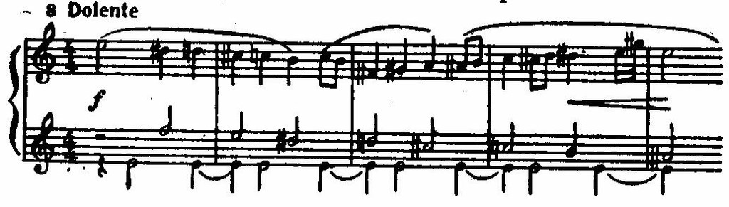 Эпизоды Lento и Vivo в конце пьесы выводят из танцевальной сферы. Характерна прозрачная фактура пустых квинт и движущихся по хроматическому ряду параллельных больших терций (второе предложение после гаммы глиссандо).