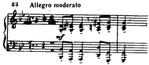В дальнейшем эта фигура играет роль своеобразного «лейтритма», пронизывающего всю первую часть. Особенно настойчиво звучит она в разработке, напоминающей по своей динамической целеустремленности, последовательному и непрерывному проведению единой восходящей динамической линии разработку из первой части Второго фортепианного концерта. Линия длительного, напряженного нарастания распространяется и на главную партию репризы, которая очень сильно динамизирована и сохраняет по изложению разработочный характер.