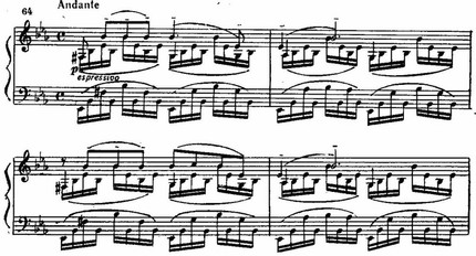 Медленно ширясь и нарастая, она как бы расцветает и звучит со все более напряженной экспрессией. В конце среднего раздела достигается яркая патетическая кульминация (Andante написано в простой трехчастной форме), после чего звучность постепенно спадает и словно истаивает к концу. Постоянно возникающие короткие подголоски и имитации придают фактуре певучий, мелодизированный характер. Насыщенная и полнозвучная, но в то же время лишенная тяжеловесной статики музыкальная ткань непрерывно живет и «дышит», создавая ощущение пространственности. Прибегая к образным ассоциациям, можно сравнить эту часть с баркаролой — «пением на воде», или с привольной, от души льющейся песней посреди широких полевых просторов.