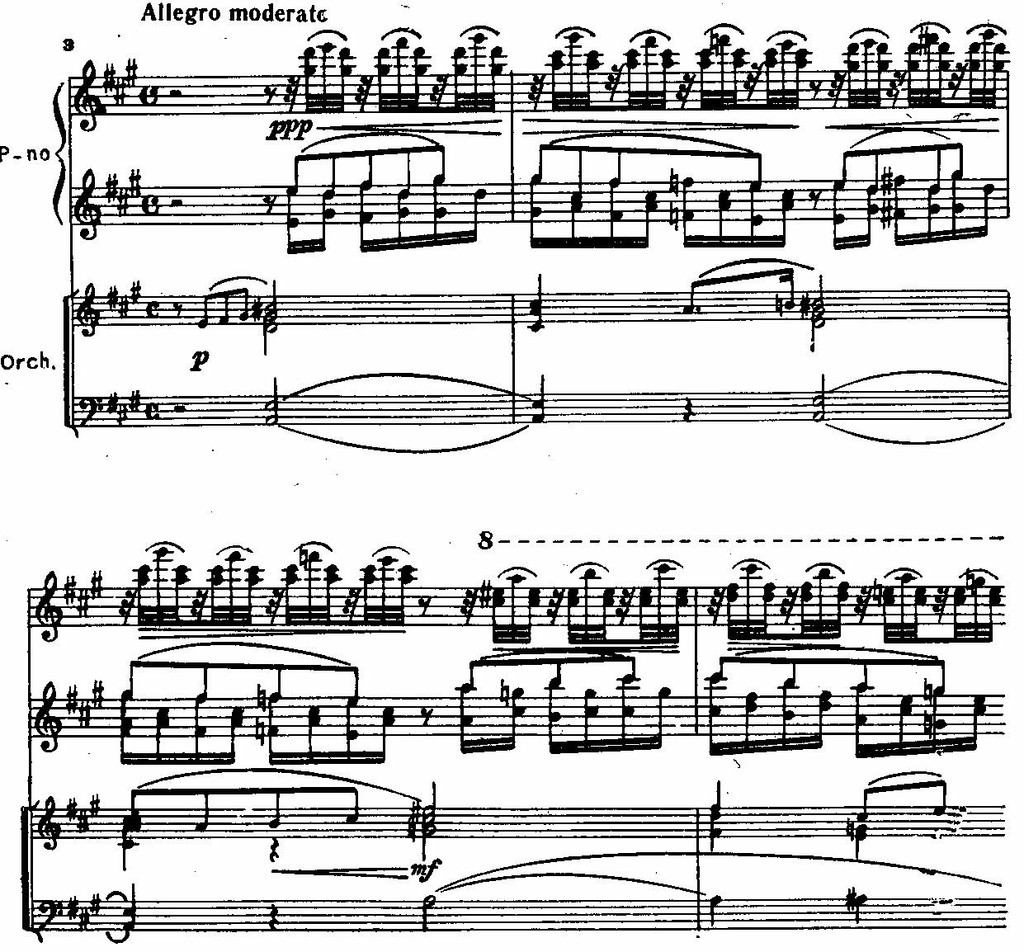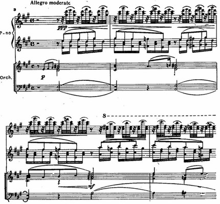 Разработка в первой части отличается компактностью и ясностью структуры. Не считая вступительного оркестрового построения, она четко распадается на два раздела, причем сначала развивается тема побочной, затем — главной партии, которая достигает здесь патетического звучания, образуя одну из центральных кульминаций в этой части концерта. После репризы, не содержащей по сравнению с экспозицией существенных изменений в изложении материала, дана большая каденция, приобретающая значение второй разработки. Здесь материал развивается в той же последовательности, как и в собственно разработке, но только в более свободной импровизационной манере, соответствующей характеру и назначению каденции в сольном инструментальном концерте. Заключительный эпизод каденции — Maestoso, где тема главной партии, данная в массивном аккордовом изложении, звучит мощно и величественно,— является главной и наивысшей кульминацией всей первой части. Тем самым каденция логически включается в общий план развития и становится органически неотъемлемым элементом формы. Подобная ее трактовка предвосхищает тот замысел, который был спустя почти два десятилетия в более зрелой форме осуществлен Рахманиновым в Третьем концерте.