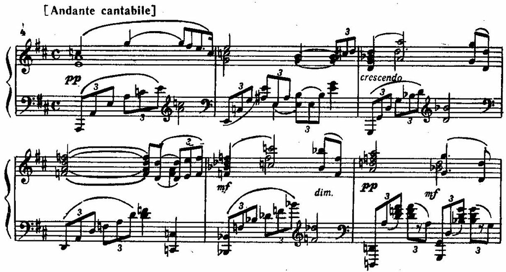 Основные темы первой части носят мягкий, напевный характер и не контрастируют резко друг с другом ни по своей эмоционально-выразительной окраске, ни в жанровом отношении. В лирически взволнованной теме главной партии можно увидеть сходство с некоторыми романтическими прообразами. Но характерно рахманиновские интонационные штрихи придают ей особый, индивидуальный отпечаток. Таков, в частности, излюбленный композитором, экспрессивно заостренный оборот уменьшенной кварты на вершинах мелодической волны: