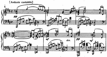 Средний раздел Andante построен на более подвижной теме, которая развивается секвенционно, с постепенным динамическим нарастанием, приводящим к патетической кульминации. Этот подъем как бы исчерпывает себя и растворяется в легком, бисерном пассаже, ниспадающем на четыре с половиной октавы и теряющемся в глухом басовом регистре. Это единственный на протяжении всего Andante случай применения виртуозной пассажной орнаментики, причем и здесь она служит определенной выразительной задаче. Возвращаясь снова, первая тема передается на этот раз оркестру. Приводимая у струнных в упрощенном, схематизированном виде, она становится элементом фона, на передний же план выдвигается мягко колышущаяся аккордовая фигура фортепиано, которая приобретает по мере нарастания все более определенные мелодические очертания, а затем так же постепенно стушевывается и угасает. В заключительных тактах еще раз слышатся таинственные «зовы» валторны, в ответ на которые у фортепиано звучат светлые аккорды, истаивающие в легкой, прозрачной выси.