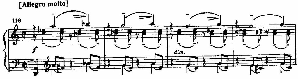 В отличие от обычного, традиционного соотношения тем сонатного allegro, побочная партия в финале не составляет лирического контраста к главной. Проникнутая такой же неудержимо рвущейся вперед энергией и напором, она развивается резкими синкопированными толчками, словно преодолевая какие-то препятствия, и образует в целом ряд тяжело вздымающихся и снова ниспадающих волн: