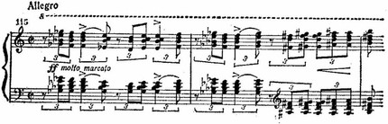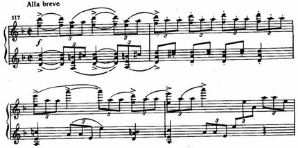 Так поступает, например, Чайковский во Втором фортепианном концерте. В первой части этого концерта Чайковского каденция занимает всю вторую половину разработки и по своей длительности даже превосходит рахманиновскую каденцию, но функция ее иная. Она подготавливает репризное вступление главной партии в оркестре. После нее идет еще обширный раздел формы, включающий репризу (хотя и с сокращенной главной партией) и коду.