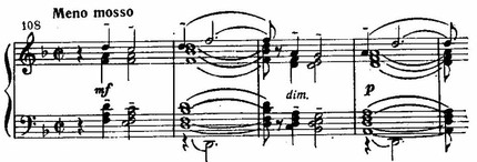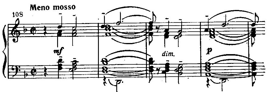 В основе этого оборота — тот же неразрешенный, словно повисающий в воздухе вопрос. Особую выразительность придает музыке густая полифоническая насыщенность фактуры, причем в разных голосах с неизменной настойчивостью звучит одна и та же нисходящая секундная интонация. Начальный квинтовый мотив первой части становится основой ритмически равномерно покачивающейся триольной фигуры сопровождения. В среднем разделе эмоциональный тон становится более беспокойным благодаря ритмическому ускорению (квинтоли шестнадцатых вместо триолей восьмыми), смене мажора минором, модуляционной подвижности тонального плана (g, с, es, cis) и постепенно развертывающемуся динамическому нарастанию. Но основной секундный мотив продолжает все время звучать и здесь. Замечательного колористического эффекта «звучащей атмосферы» достигает композитор в коде с помощью одновременного сопоставления нескольких самостоятельных звуковых планов в разных регистрах.