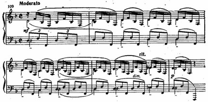 Внезапный бурный и стремительный взлет пассажей шестнадцатыми нотами звучит как попытка вырваться из этого скованного состояния, но порыв оказывается тщетным: движение наталкивается снова на властные, тормозящие аккорды и весь период замыкается начальной квинтовой интонацией.