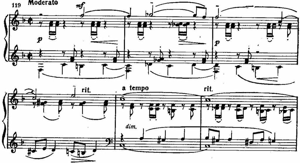 Особой тонкостью письма и своеобразием приемов обращает на себя внимание прелюдия F-dur, построенная на выразительном диалоге двух мелодических голосов. Этот «дуэтный» принцип изложения напоминает последнюю прелюдию (Ges-dur) из ор. 23. Но здесь мелодика носит более экспрессивно заостренный характер, насыщается декламационными элементами, отдельные выразительно яркие интонации выделяются и подчеркиваются посредством многократного их повторения. Интересна ладово-гармоническая основа пьесы, в которой обилие хроматизмов совмещается с ясно ощутимой диатоничностью общего строя. Так, в нижнем мелодическом голосе хроматическое опевание звуков V и VI, III и II ступеней подчеркивает тяготение к главным опорным точкам лада и тем самым усиливает ощущение ладотональной устойчивости (Здесь мы находим известное приближение к тому, что получило в советском теоретическом музыкознании определение «двенадцатиступенкой диатоники Прокофьева».):