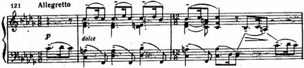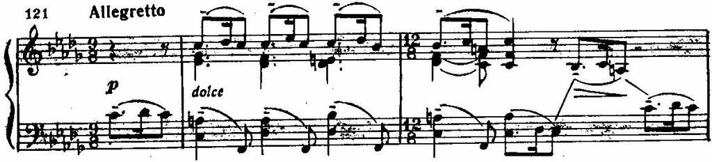 Выразительный характер этого мотива трудно определить из-за его жанровой «многоосновности». Тут есть элементы скерцозности и танцевальности, вместе с тем в мелодии настойчиво звучит интонация вздоха, скорбной жалобы. Музыка проникнута настроением смутной, безотчетной тревоги. Если можно говорить о присущих этой пьесе чертах скерцозности, то в романтическом понимании данного термина, подразумевавшем не столько веселую шутку, сколько причудливое, необычное, порой таинственное, иронически «остраненное».