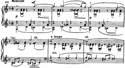 Одним из самых ярких примеров ритмической остинатности Рахманинова является прелюдия b-moll, основанная на непрерывном звучании трехдольной пунктирной фигуры, которая варьируется лишь интервально, но при всех повторениях не изменяет своей ритмической формы: