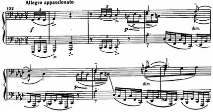 В среднем разделе прелюдии основной мелодико-ритмический мотив видоизменяется. Данный в двойном ритмическом увеличении, в октавном изложении с сопровождением беспокойно пульсирующих аккордов, в звучании fortissimo, он приобретает страстно протестующий драматический характер. Безнадежно никнущее движение сменяется постепенным тяжелым восхождением, которое заканчивается внезапным трагическим срывом (Этот серединный раздел напоминает и по мелодическому рисунку и по фактуре ариозо f-moll Малатесты из «Франчески да Римини», где выражена внезапная вспышка страсти и гнева у человека, одержимого мучительным сомнением.). И снова устанавливается глухое безмолвие, нарушаемое лишь короткими скорбными возгласами и вздохами (тема проводится сначала в варьированном виде на доминантовом басу, затем следует собственно реприза).