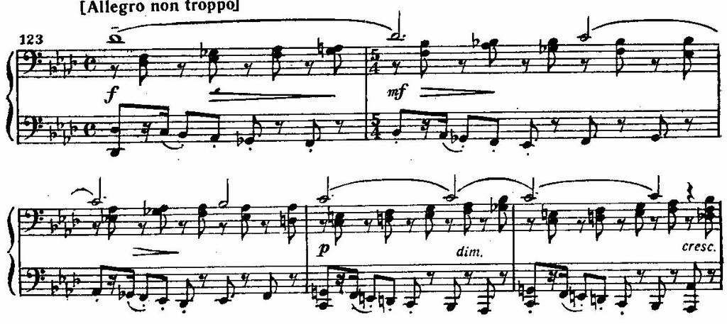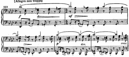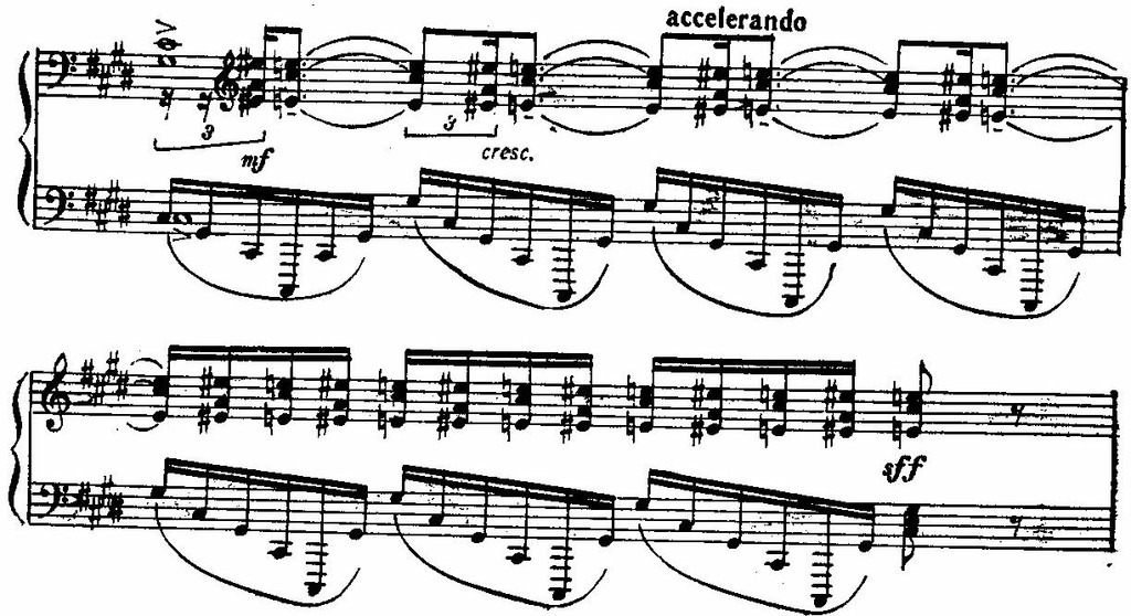 Особую тревожную окраску придают музыке «соскальзывающие» хроматизмы eis — е в приведенном примере, порывистые «скрябинские» ритмы во втором разделе (Tempo I). Вся пьеса выдержана на высочайшем динамическом уровне звучания ff, fff). Непрерывное ритмическое и фактурное нагнетание доводит чувство напряженного ожидания до пределыюго накала.