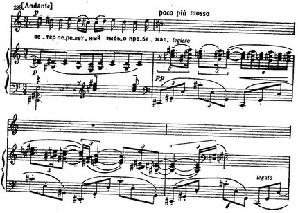 Те же или сходные образные элементы — море, «где крутился вал», чернеющие тучи — в совершенно ином плане представлены в романсе «Ветер перелетный» на слова К. Д. Бальмонта. Тонкая импрессионистическая игра светотени, зыбкость, изменчивость оттенков, свойственные поэтическому тексту, замечательно переданы Рахманиновым в музыке романса. Неподвижность, застылость общего фона, создаваемая плавно колышущимся остинатным ритмом сопровождения и медленным смещением основных гармонических устоев, соединяется с детальной красочно-изобразительной нюансировкой. Звукоизобразительное значение свойственно и некоторым оборотам вокальной мелодии. Таков, например, «парящий» волнистый мелодический рисунок на словах «ветер перелетный зыбью пробежал» (Посвятив этот романс Собинову, Рахманинов, вероятно, рассчитывал на его легкий, светлый по тембру голос. Собинову посвящен и ряд других романсов этой серии, в том числе «Арион», «Какое счастье».). «Соскальзывающие» хроматизмы у фортепиано в последующих тактах напоминают отмеченный выше гармонический оборот из этюда-картины cis-moll, но здесь благодаря приглушенной динамике и легкости фактуры возникает образ не грозно полыхающих зарниц, а тихого, еле заметного мерцания: