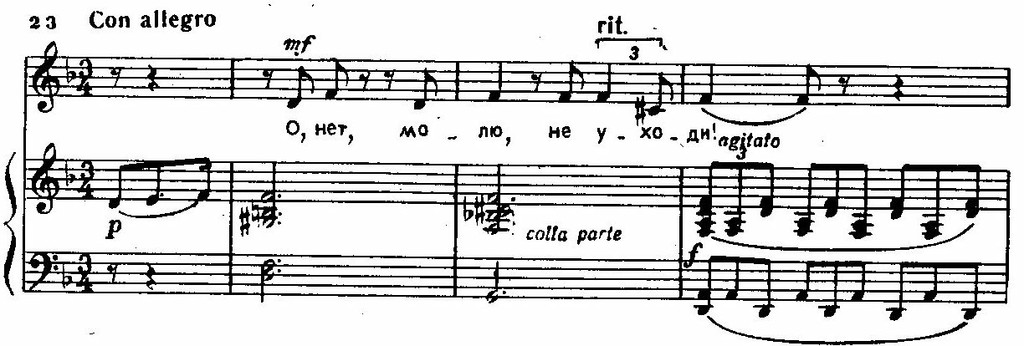 Этот оборот становится «лейтинтонацией» романса. С особой выразительной силой звучит он в момент драматической кульминации на словах повторяющегося страстного призыва: «О, будь со мной, не уходи!» Бурлящие триоли аккомпанемента, подобно набегающим волнам, усиливают беспокойный, смятенный пафос музыки романса.