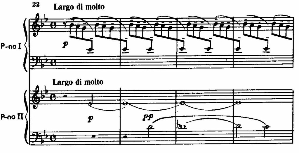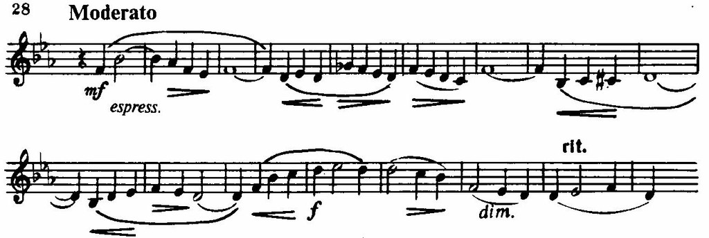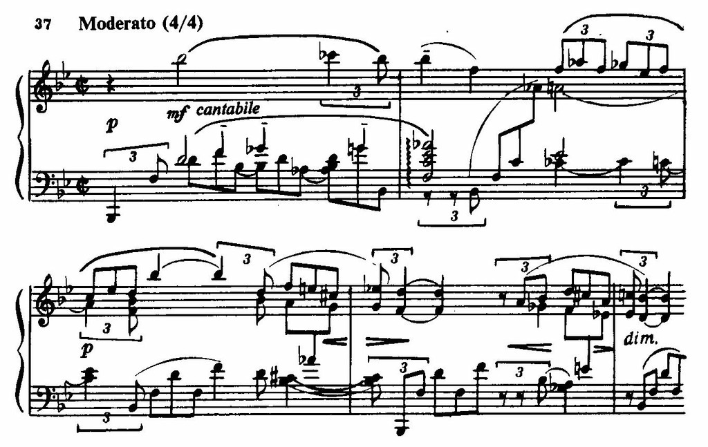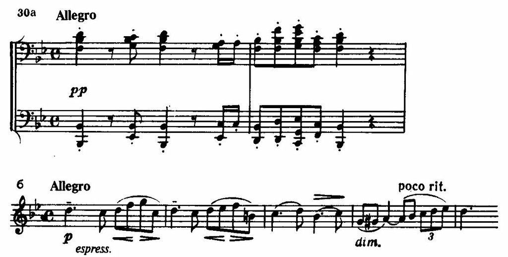 Вначале сурово и сумрачно звучащая тема приобретает в ходе развития более мягкую лирическую окраску и продолжается у фортепиано, которое выполняло до этого сопровождающую роль, окутывая мелодию гулкими полнозвучными пассажами.