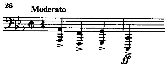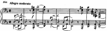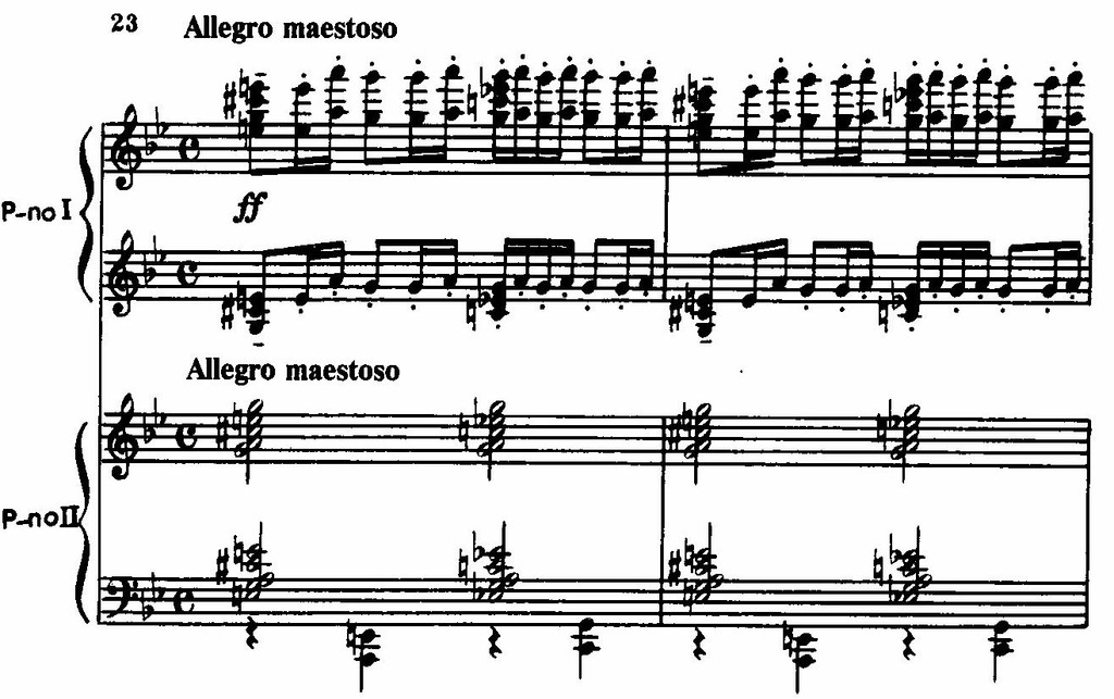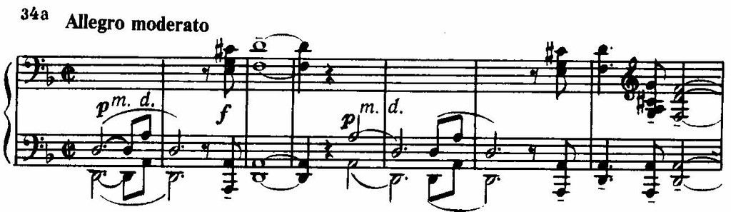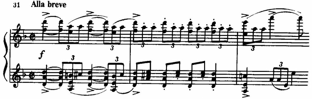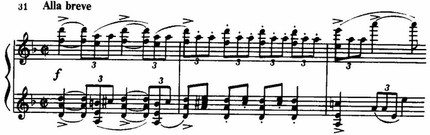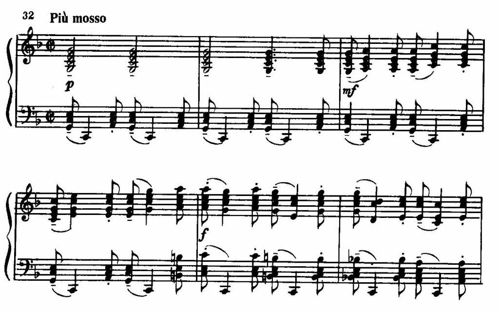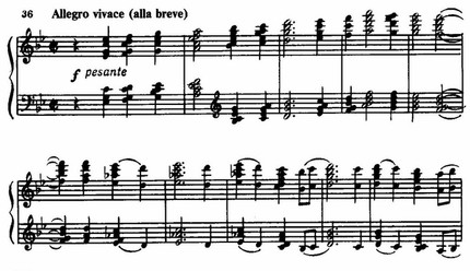 Тот же неудержимый напор волевой энергии, закованной в жесткие рамки неизменного синкопированного ритма, слышится и в излагаемой полнозвучными аккордами теме побочной партии.