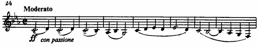 Лейтмотивное значение приобретает и тема побочной партии, своей величавой, спокойной торжественностью и контрастирующая взволнованно-драматической главной.