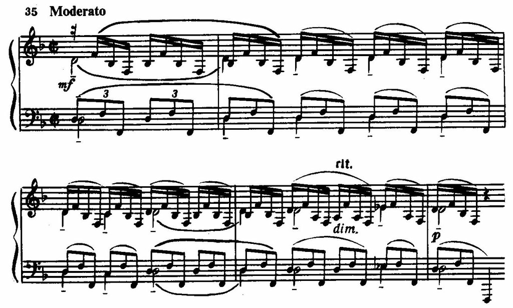 Другой тип пьес представлен быстрыми подвижными прелюдиями, основанными на непрерывном моторном движении. Такова патетическая до-минорная прелюдия с ее волнообразно набегающими пассажами и непрерывно чередующимися динамическими взлетами и спадами. К тому же типу принадлежит прелюдия ми-бемоль минор, в хроматическом движении которой двойными нотами слышатся отзвуки каких-то грозно завывающих вихрей. При этом звучность приглушена, лишь на короткие моменты достигая относительной силы, преобладают же нюансы р и pp. Создается впечатление изредка вырывающейся наружу скрытой душевной бури.