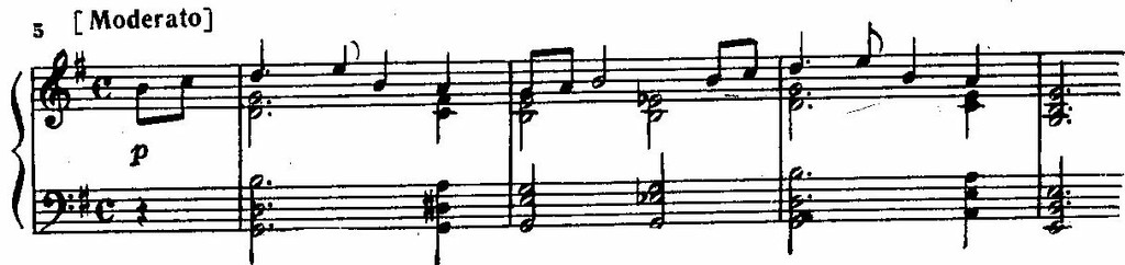 Сходство есть и в приемах гармонизации. Таков, в частности, проходящий хроматический звук между V и VI ступенями в одном из средних голосов, придающий особую мягкость звучанию темы. Это, конечно непреднамеренное, совпадение определенным образом окрашивает тему рахманиновской рапсодии, придавая ей некоторый ориентальный оттенок. (Подобное же сочетание русского и восточного колорита мы находим в первой теме Четвертой симфонии А. К. Глазунова, написанной двумя годами позднее рахманиновской рапсодии.)