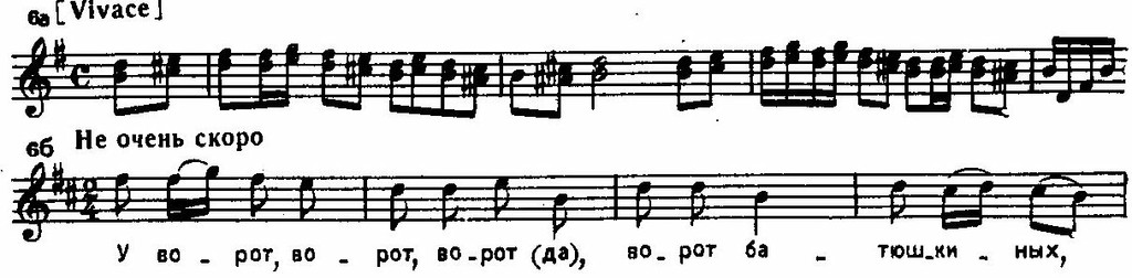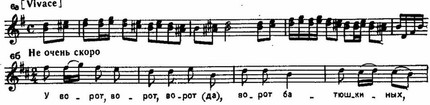 Цикл вариаций распадается на несколько групп, объединенных общностью характера и приемов изложения. Первую группу образует тема с примыкающей к ней вариацией, в которой основной мелодический рисунок остается неизменным и только оплетается пассажной орнаментикой. Эпизод типа каденции отделяет этот начальный, экспозиционный раздел от следующей группы вариаций скерцозного характера в темпе Vivace. Изменению облика темы, помимо скорости движения, способствует ритмическое дробление мелодии и острое стаккатное изложение. Во второй вариации этой группы (цифра 9) тема приобретает явно выраженное сходство с шуточной плясовой песней «У ворот, ворот батюшкиных» (для удобства сравнения песня транспонирована).