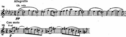 Характерна по своему выразительному складу первая тема Allegretto, заключенная в узком диапазоне кварты (только один раз затрагивается звук as, выходящий за пределы этого интервала) с упорным повторением одной нисходящей интонации. Постоянное хроматическое соскальзывание звука d в des создает впечатление ладовой двойственности, колебания между параллельными тональностями Ges-dur и es-moll (эта двойственная ладовая природа темы подчеркнута и ее гармонизацией).