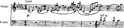 Первый из них развертывается в начале, где диатонический напев флейты соединен с таким же спокойным, но иным по очертаниям мелодическим рисунком, — предельная экономия не только слов, но и мысли, редкая концентрация лирической эмоции: