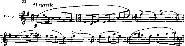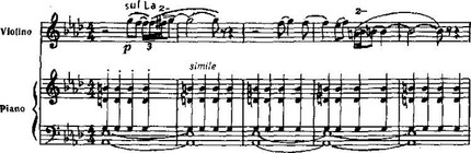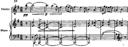 Тема четка по своему рисунку, далека от романтической выразительности, которая еще встречалась тогда у ряда композиторов. Чистота и ясность линии — главная забота композитора. Еще проще, даже архаичнее вторая тема, где диатонический напев скрипки сопровождается пустыми квинтами фортепиано (Равель уже использовал сходный прием в аккомпанементе романса «Ронсар — своей душе»):