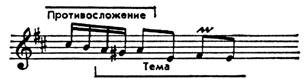 и т. п.), сцеплением мотивов, см., напр., совмещение каданса противосложения с началом темы в 15-й инвенции Баха: