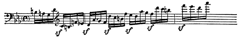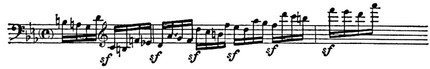 ) воспринимаются почти как квинтоли. Такую же смягчающую роль у романтиков часто играют синкопы; очень характерны синкопы, образуемые отставанием мелодии (выписанное рубато в старом смысле), как в гл. партии Фантазии Шопена. В романтич. музыке появляются «большие» триоли, квинтоли и др. случаи особого ритмич. деления, соответствующие не одной, а неск. метрич. долям. Стирание метрич. границ графически выражается в вязках, свободно переходящих через тактовую черту. В конфликтах мотива и такта мотивные акценты обычно доминируют над метрическими (это очень характерно для «говорящей мелодики» И. Брамса). Чаще, чем в классич. стиле, такт сводится к воображаемой пульсации, к-рая обычно менее активна, чем у Бетховена (см. начало симфонии «Фауст» Листа). Ослабление пульсации расширяет возможности нарушений её равномерности; романтич. исполнению свойственна максимальная темповая свобода, тактовая доля по длительности может превышать сумму двух непосредственно следующих за ней долей. Такие расхождения между фактич. длительностями и нотными обозначениями отмечены в скрябинском исполнении собств. произв. там, где в нотах нет указаний на изменения темпа. Поскольку по отзывам современников игра А. Н. Скрябина отличалась «ритмич. ясностью», здесь полностью обнаруживается акцентная природа ритмич. рисунка. Нотные обозначения указывают не длительность, а «весомость», к-рая наряду с длительностью может быть выражена др. средствами. Отсюда возможность парадоксальных написаний (особенно частых у Шопена), когда в фп. изложении один звук обозначается двумя разными нотами; напр., когда на 1-ю и 3-ю ноты триоли одного голоса попадают звуки др. голоса, наряду с «правильным» написанием