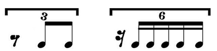 Например, триоль из восьмых нот по временнуй протяжённости равна двум восьмым основного деления, или одной четверти; квинтоль из шестнадцатых — четырём шестнадцатым основного деления, или одной четверти. В произвольном Р. д. трёхдольных длительностей дробные доли в некоторых случаях длиннее основных долей, например: две дуольные восьмые равны трём восьмым основного деления и т. п. (см. примеры). В ритмические группы произвольного деления могут входить паузы, равные по длительности замещаемым ими дробным долям, напр.: