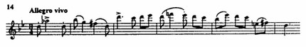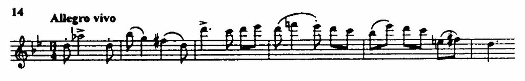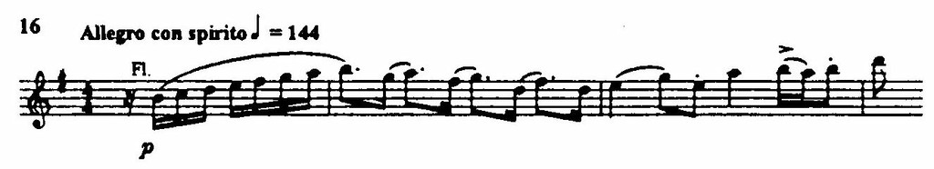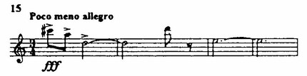 Побочная тема — в более замедленном движении, певуче-пасторальная; ее формулируют деревянные духовые инструменты (первоначально флейта) в пронизанной подголосками фактуре. Экспозицию завершает появление новой темы, крайне лапидарной (из пяти звуков), но насыщенной большим динамическим зарядом, который сообщают ей как размашистый рисунок интервалики, так и ритм (пример 15). Это и есть сквозная тема, составляющие которой равно порождены элементами главной и побочной партий. Краткая, но активная разработка, в основном на мотивах главной темы, подводит к зеркальной репризе.