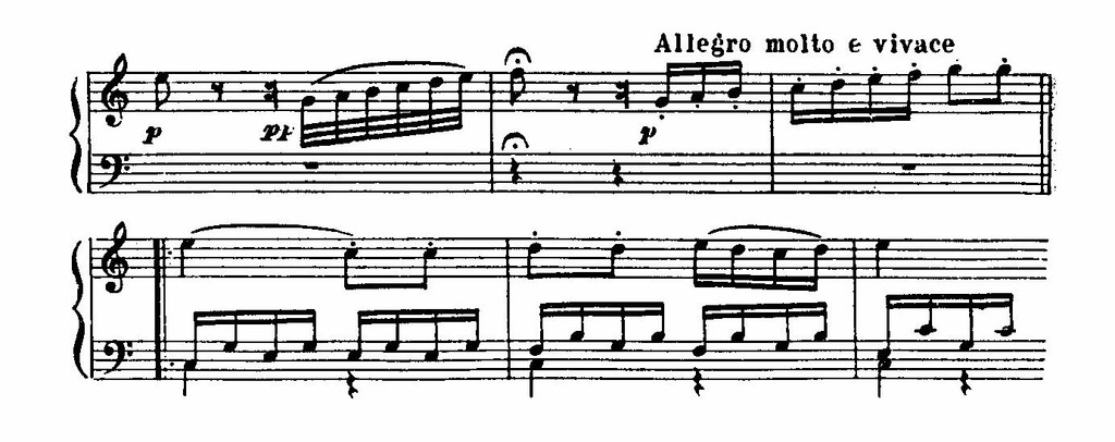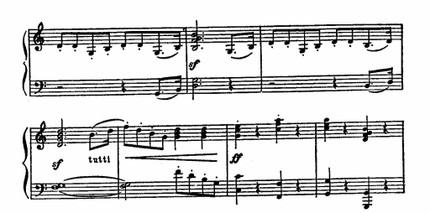 Так и в легкой, «танцевальной» главной теме (отчасти напоминающей главную партию из симфонии Моцарта «Юпитер») вместо обычной замкнутой симметрии с самого же начала преобладает целеустремленное движение. В ней уже содержатся элементы изложения, развития и «суммирования» (Восходящее движение мелодии, мотивное вычленение, дробление в третьей четверти, модуляции, оркестровое нарастание – все это создает эффект последовательного развития.). В сонатных allegro ранних венских классиков эффект tutti играл роль обрамления по отношению к завершенному «излагающему этапу» главной партии. Здесь же оркестровое tutti участвует в развитии, вторгаясь в момент «суммирования», до окончания изложения самой темы: