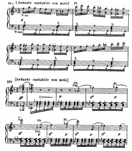 Но как раз в тот момент, когда ее завершает и обрамляет традиционный ритурнель, Бетховен неожиданно показывает эту тему в новом и резко контрастном аспекте. Переданная басам на pianissimo, с новой контрапунктирующей мелодией у духовых, она теперь звучит углубленно, серьезно, взволнованно: