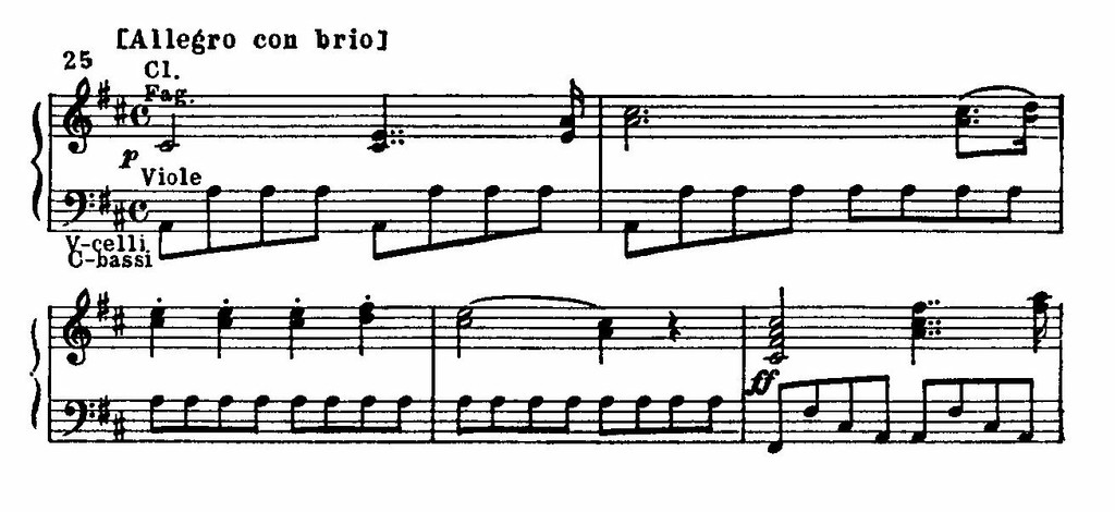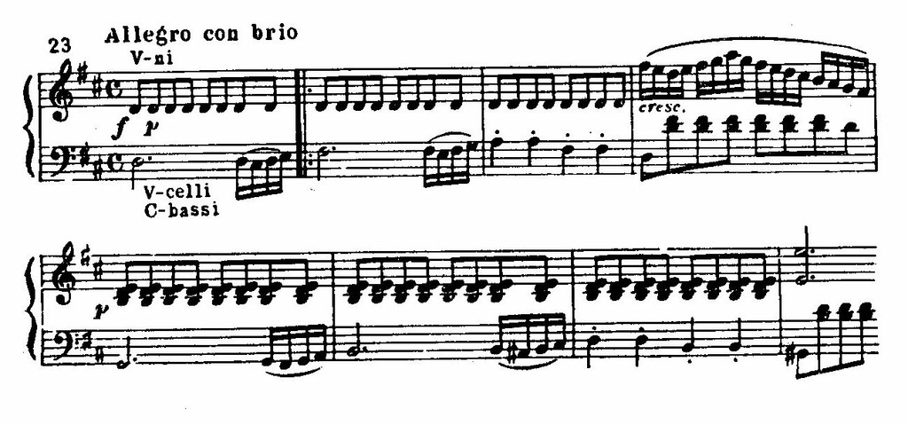 В третьей части рождается новая форма скерцо. Здесь Бетховен преимущественно развивает и обостряет юмористические приемы в музыке своих предшественников. Эффект неожиданных, дерзких нарушений неизменной формы движения – обычный выразительный прием бетховенских скерцо. Стремительный темп, отсутствие мелодической плавности, резкие смены динамики, ритмических акцентов, регистров, отрывистое звучание характерны и для скерцо Второй симфонии.