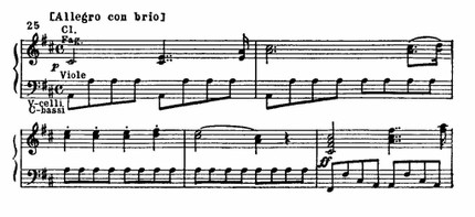 Эта ярчайшая во всей экспозиции тема приходится на связующую партию (превращение связующей партии в тематически самостоятельный раздел экспозиции – прием, перенесенный Бетховеном из увертюры и придающий музыке особый драматизм). Энергичная ритмика этой темы, отрывистые интонации, равномерное, настойчивое движение рождают представление о шествии. В ее почти элементарной гаммообразной мелодии кроется удивительная выразительность.