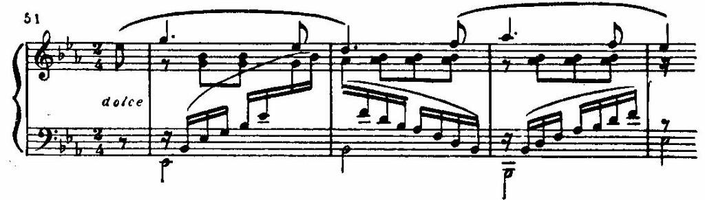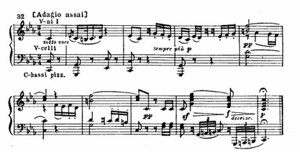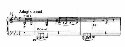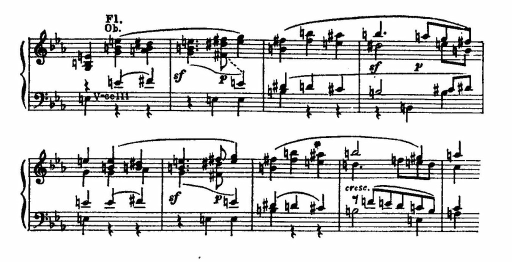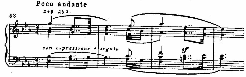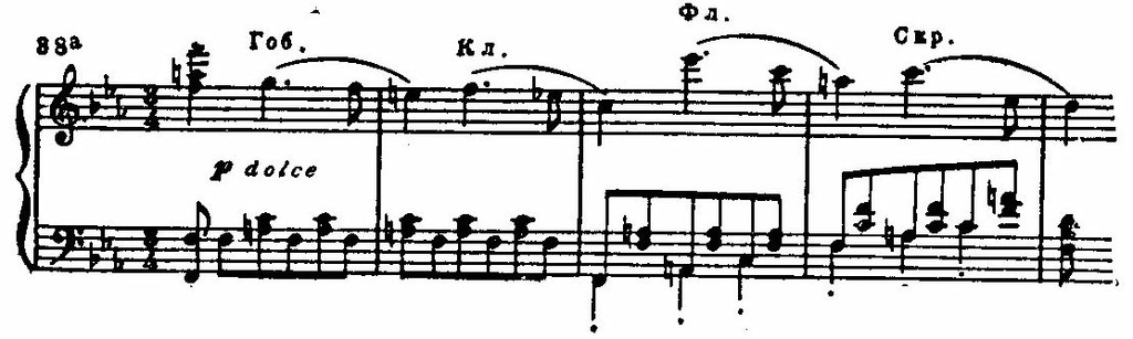 Но в самый острый момент напряжение иссякает. Оркестровые аккорды замолкают, и на тихом, шелестящем фоне, в далекой тональности e-moll возникает новая, певучая тема: