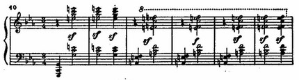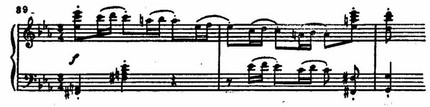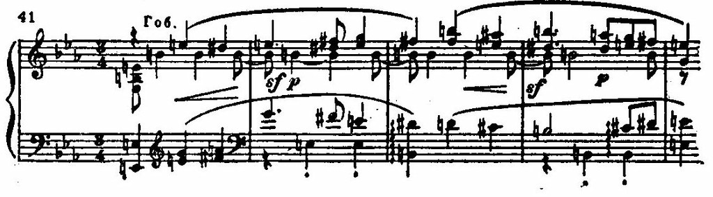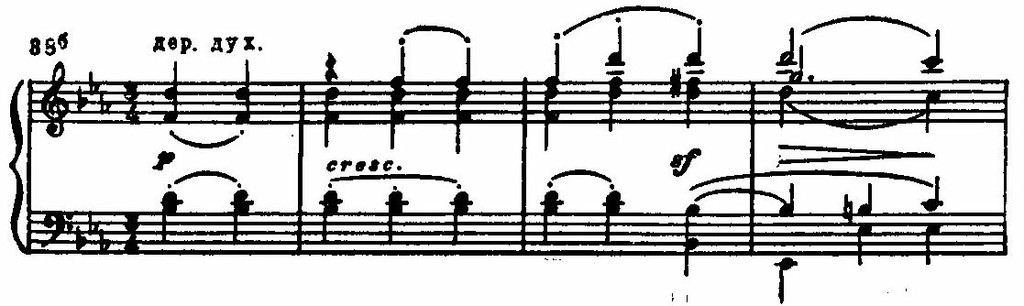 Особой напряженностью отличается подход к наивысшей точке. Здесь упорно повторяются самые неустойчивые, диссонирующие звучания. Грозные, могучие окрики предвещают катастрофу.