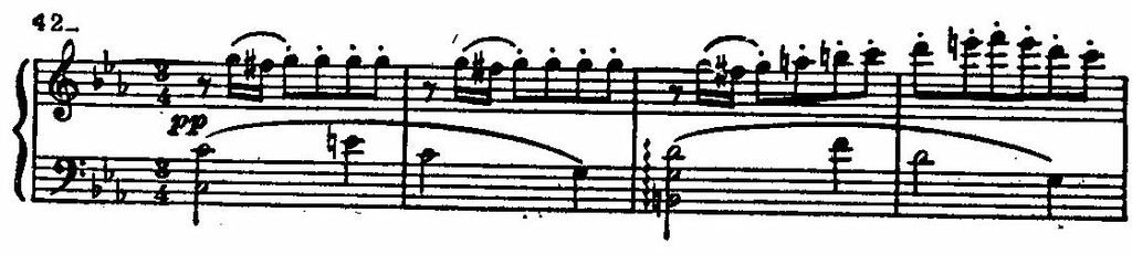 Лишь только смолкли вздохи горести и скорби, как будто издалека начинают доноситься неясные шорохи, шумы. Едва можно уловить за ними быстрое мелькание задорно-танцевальной мелодии: